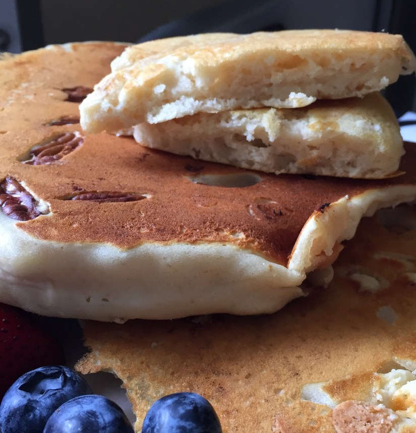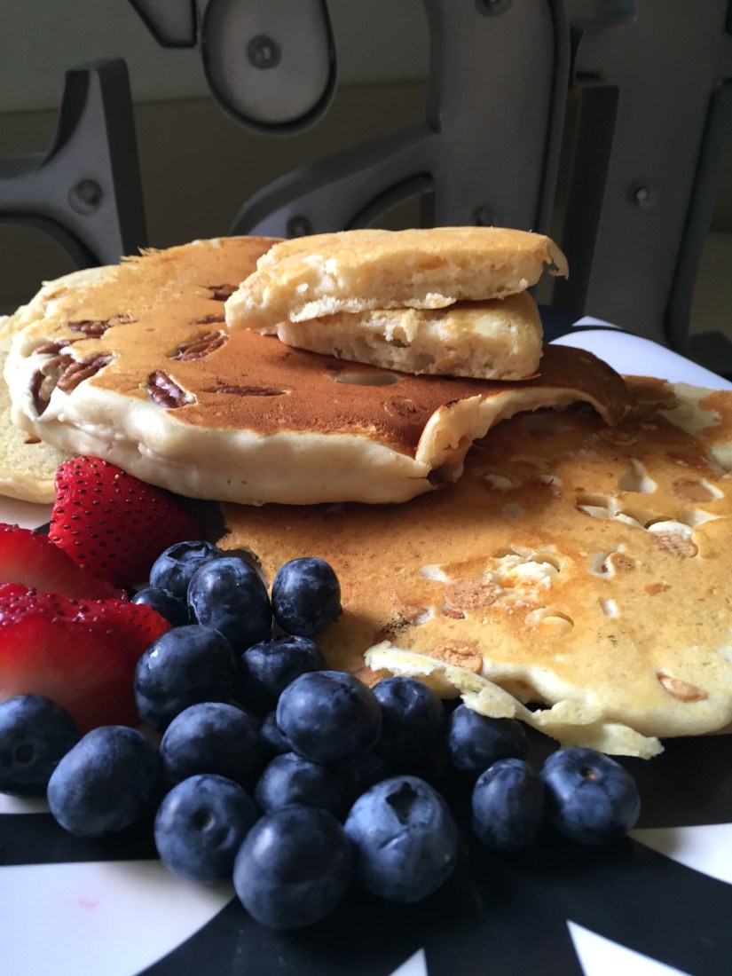 These are amaaaaaaazing! I can’t tell you the last time I had pancakes, so I was more than excited to indulge in these! I can eat only oatmeal for so long! You can be creative with ingredients such as protein, nuts, fruit and so on. We used pecans and peanut butter and white chocolate chips for our pancakes. I’m glad my husband woke up when he did or he wouldn’t have had anything to eat for breakfast! I couldn’t stop eating off the plate as they cooled! Get to cookin’ good lookin’!