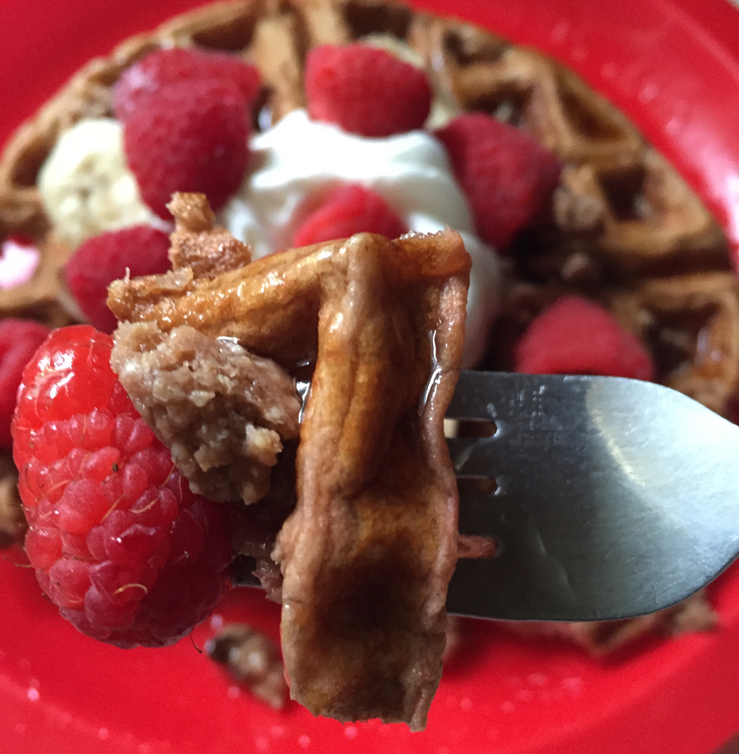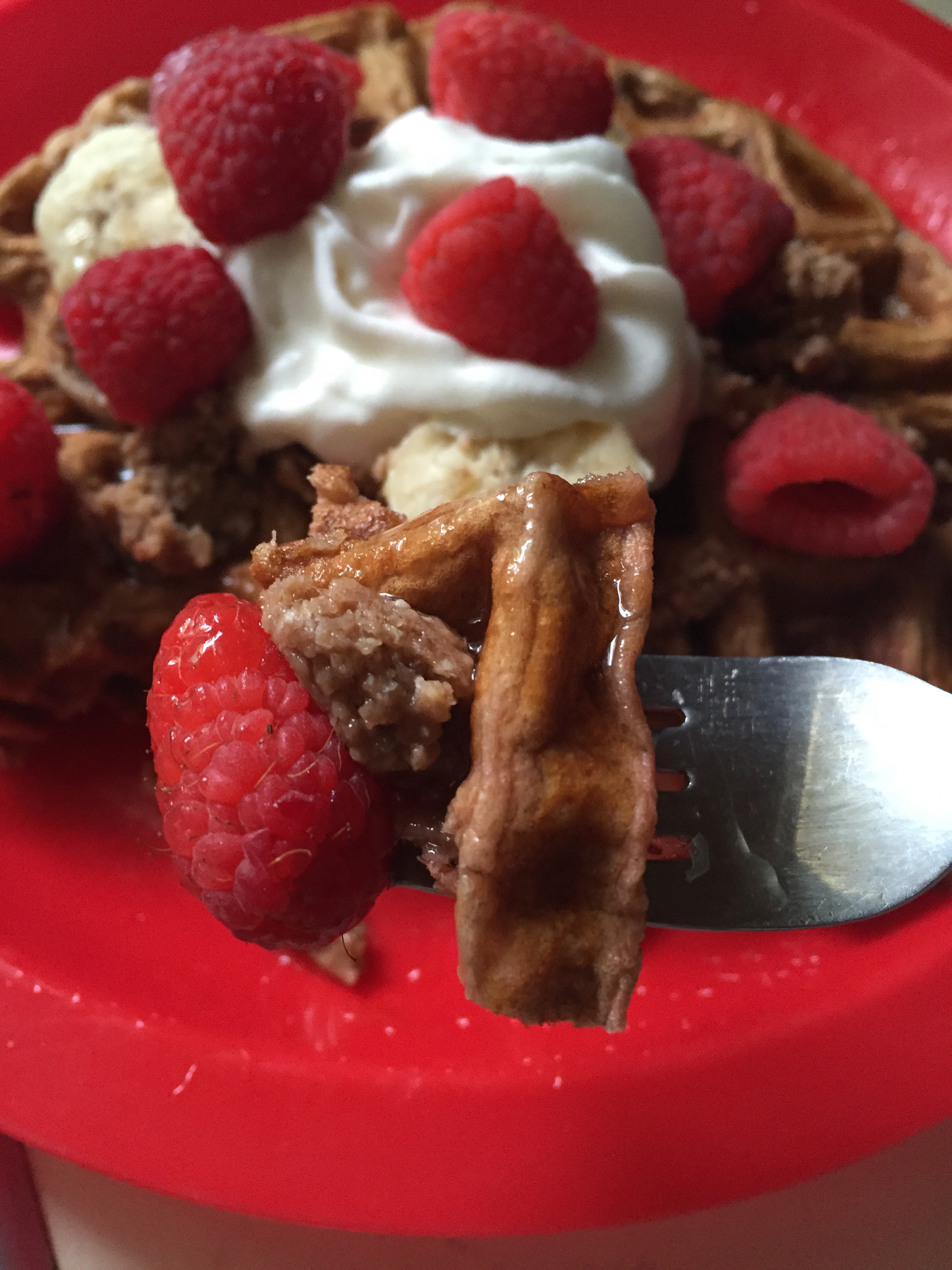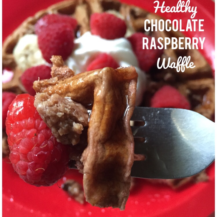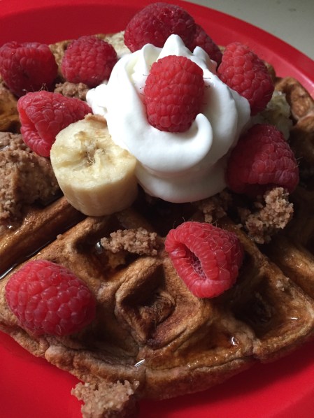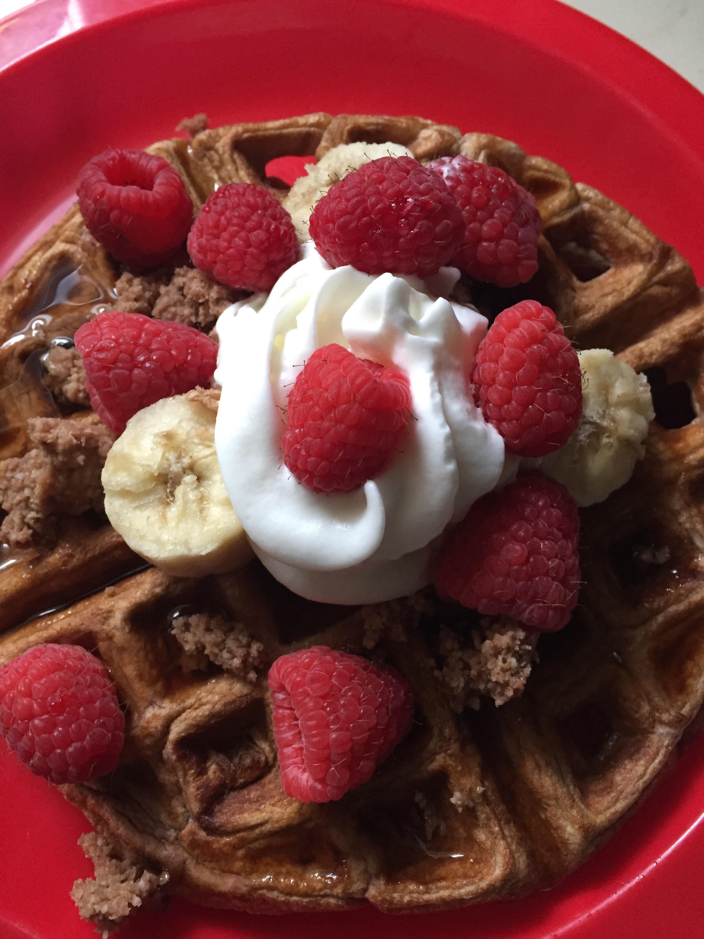 For this particular waffle, I used a chocolate protein, sugar free syrup, light whip cream, raspberries and bananas!