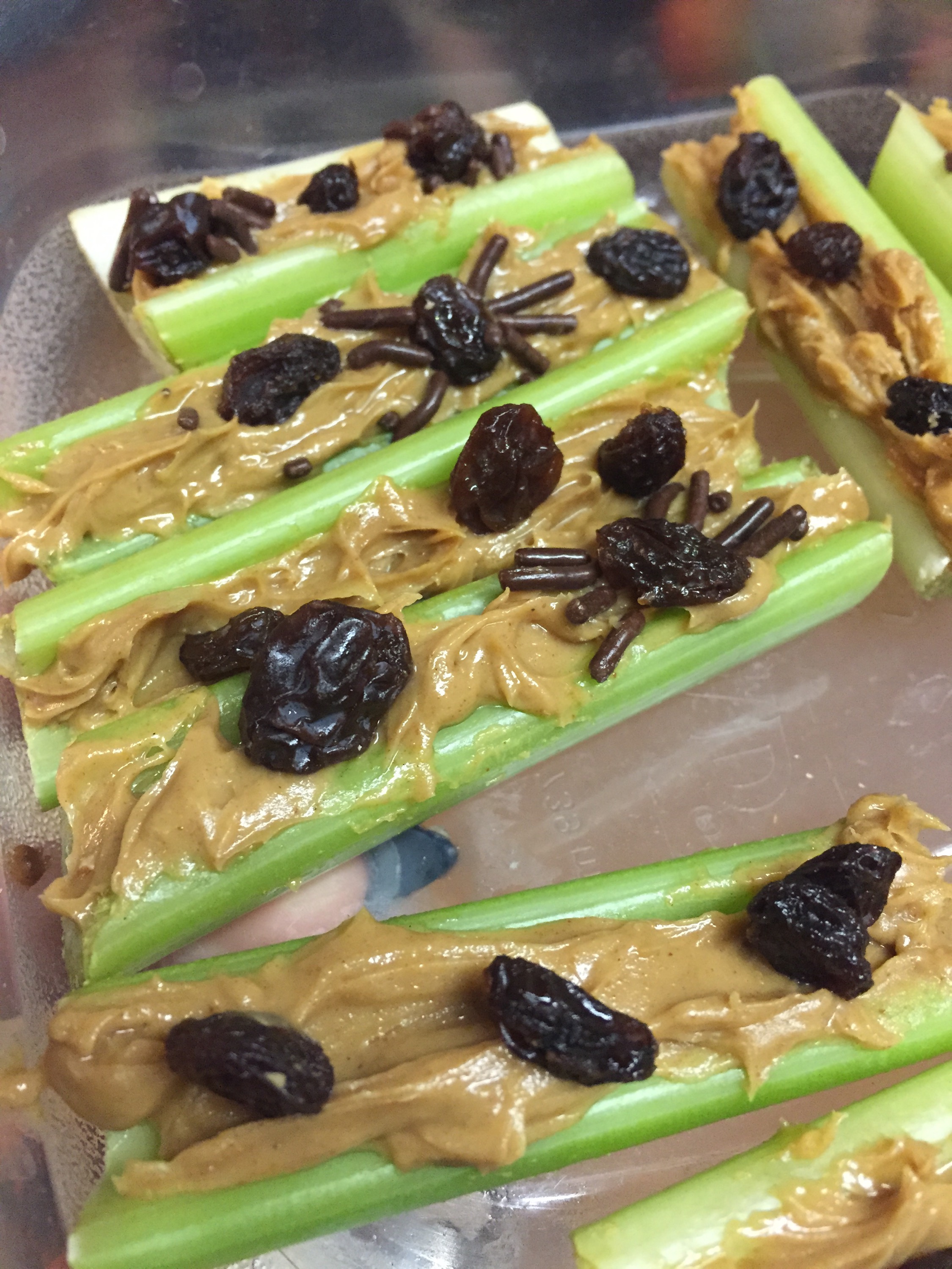 Cut your celery into serving size pieces, fill with peanut butter and add your raisins.