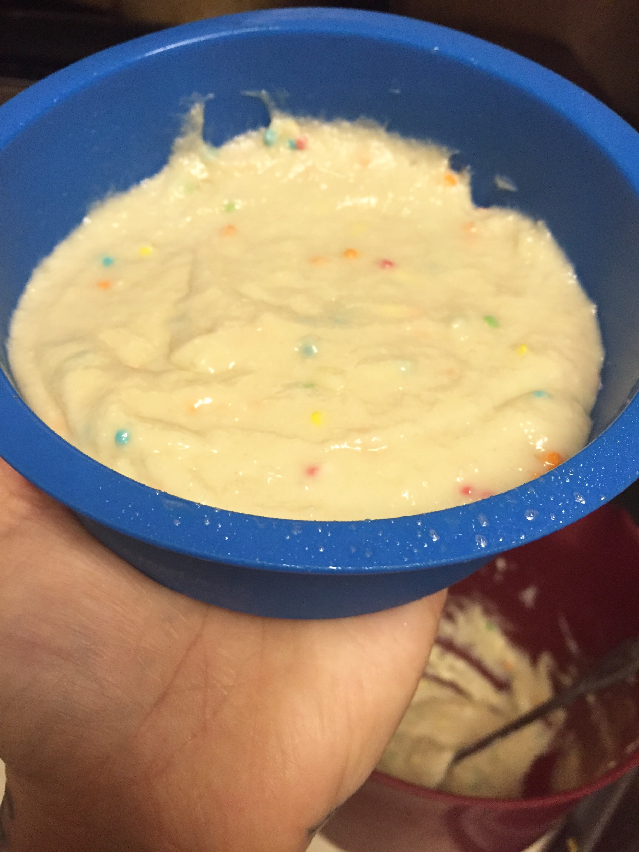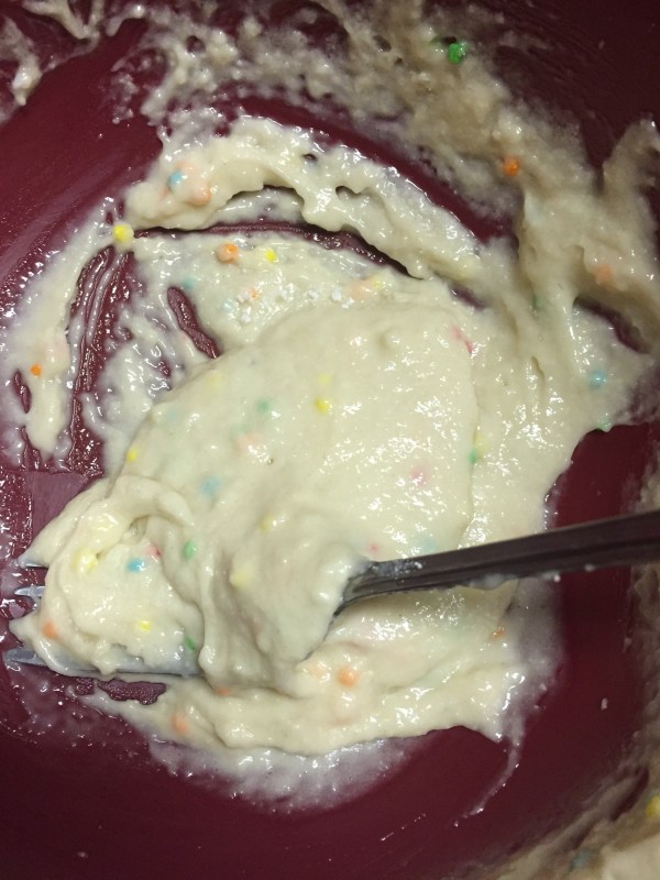I used half a box of confetti cupcake mix from Duncan Hines. You can make the whole box if you want and use the left over batter for cupcakes, cookie cakes or other baking recipes. I use dry mix with a lot of things. Try a tablespoon in your smoothies, protein shakes and yogurt!