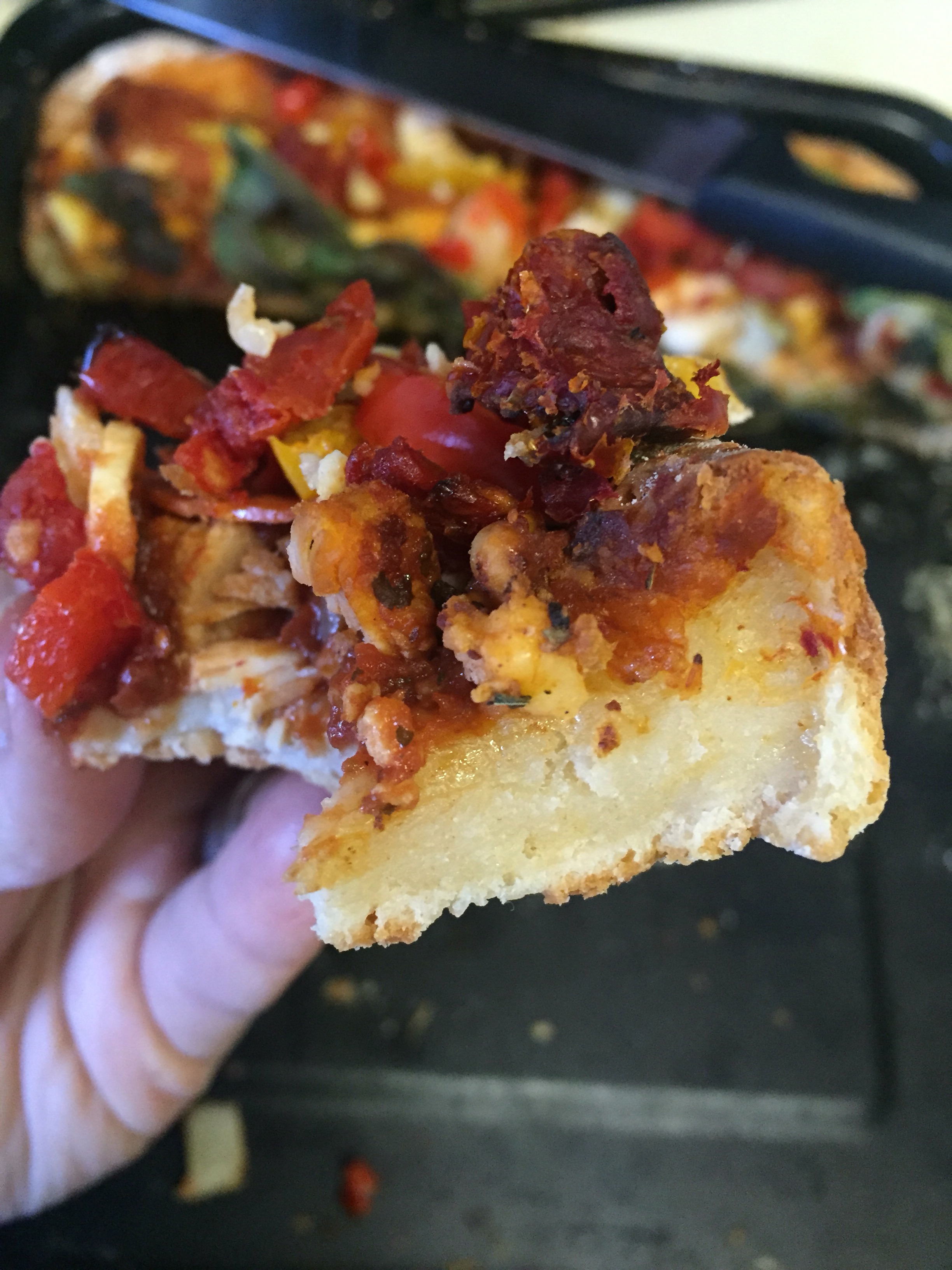 Our first pizza was a thicker dough that your teeth sink right into but still had a little crunch!