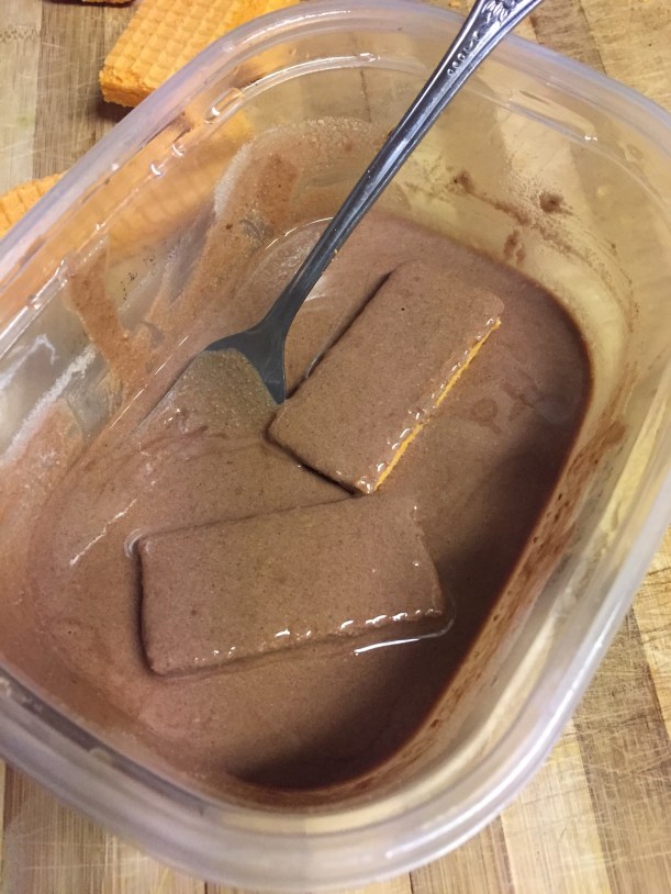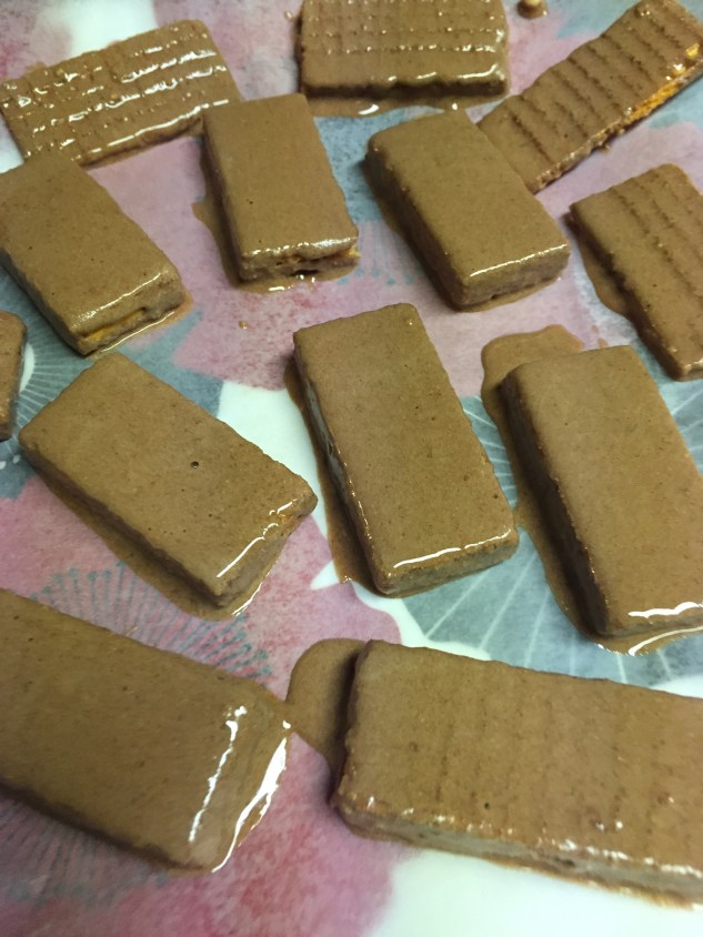Dip your wafers into the mixture. Allow both sides to get a nice coating. Use your fork to remove and place waffers on a baking sheet with parchment paper.