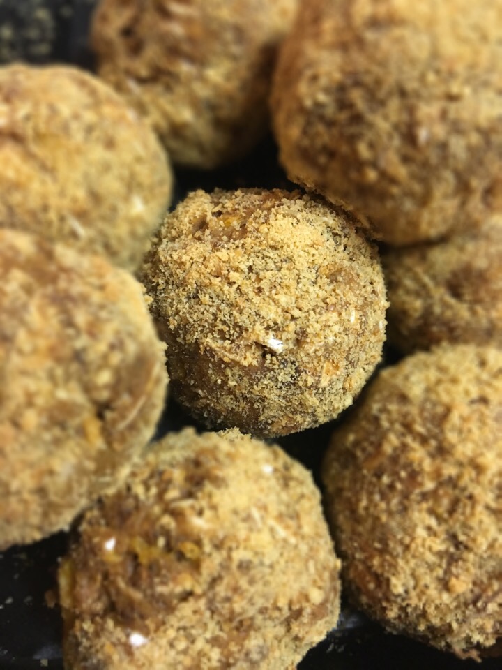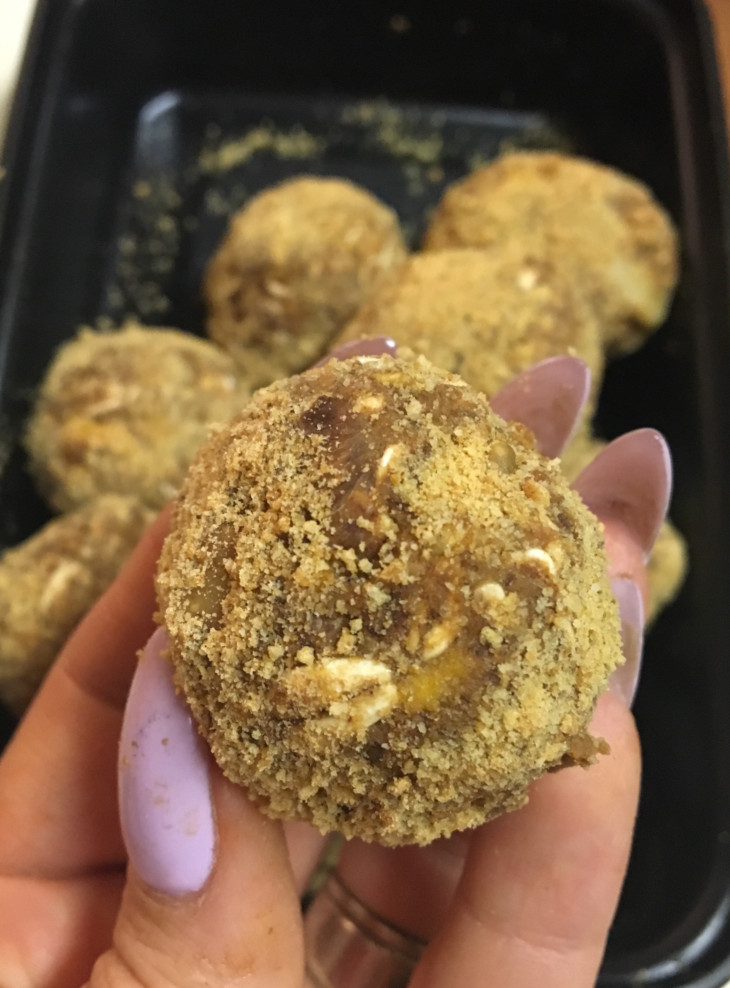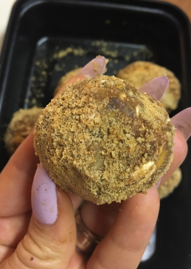 3.) Form your mixture into balls and roll through the bowl of graham cracker crumbs. Roll through a couple times to be sure you get a nice coating!