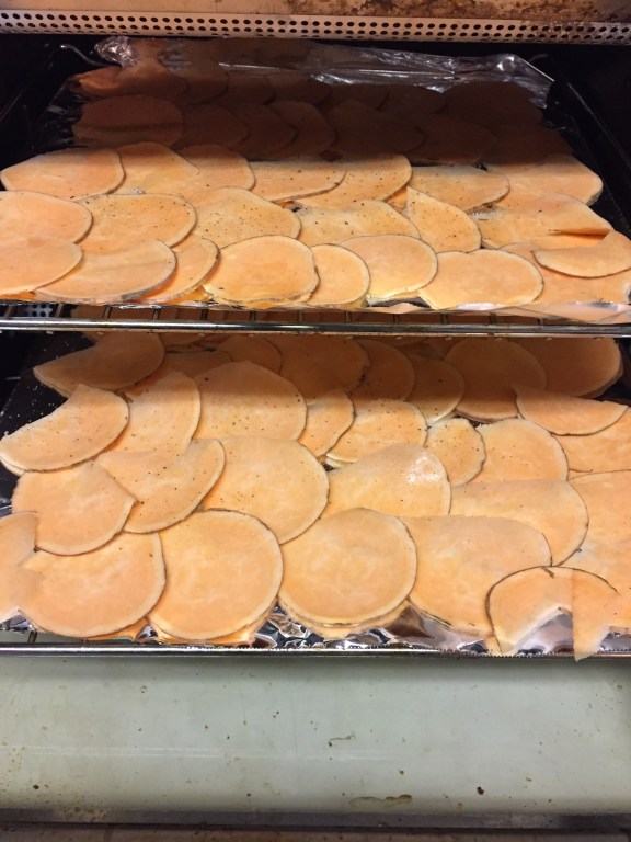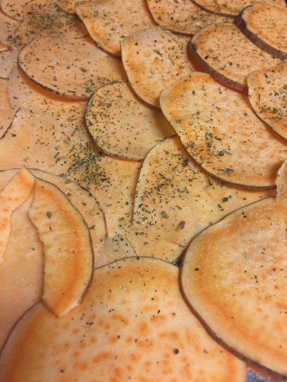 2 medium sweet potatoes (sliced thin, the thinner the crispier!)