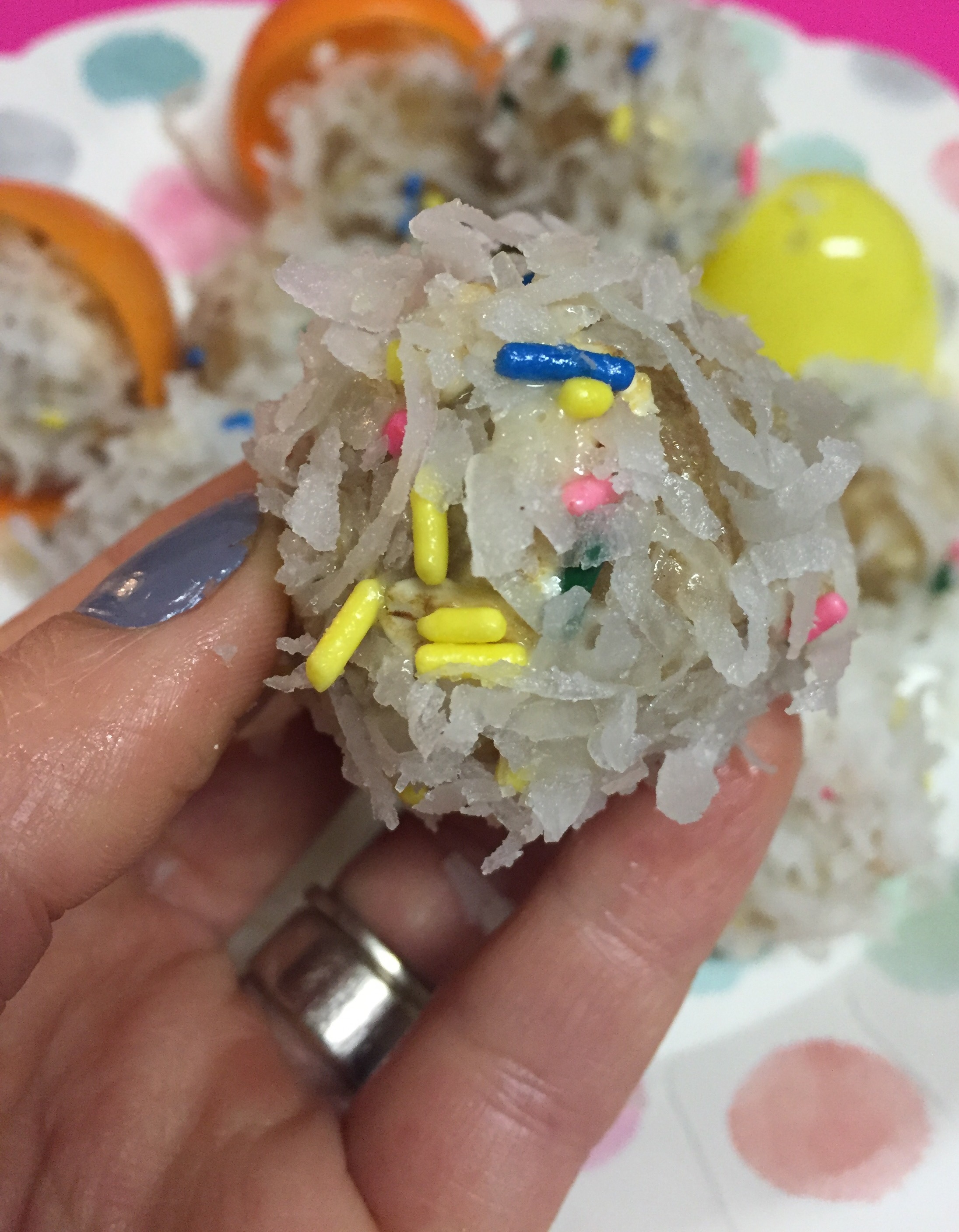 Coconut flakes are the perfect ingredient when preparing treats for Easter! Plus, the protein balls can be made all at once in your food processor! I used festive eggs, colored candies and sprinkles to give it a festive feel!