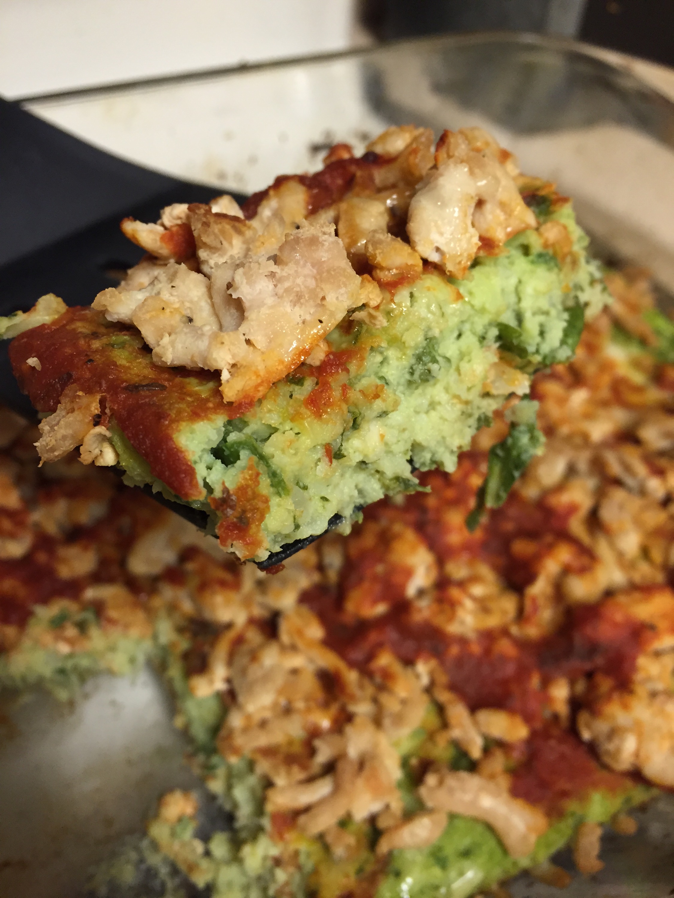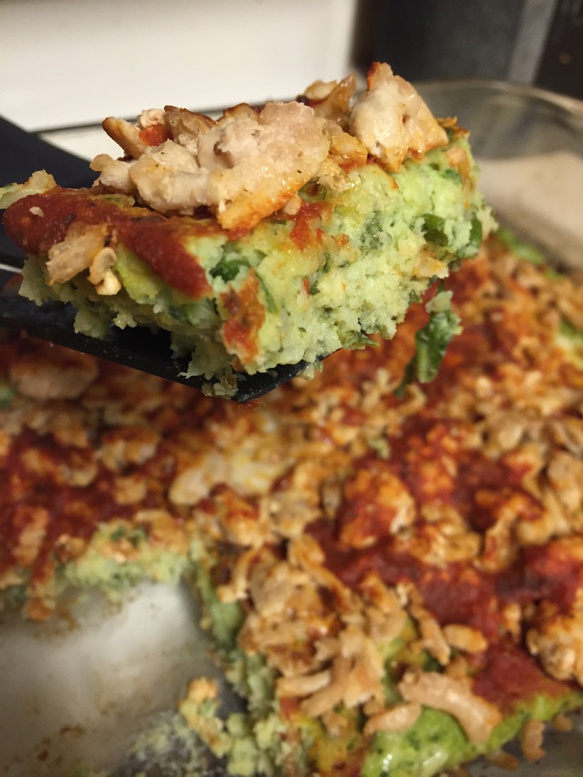 Using your food processor you can make this delicious veggie crust pizza with spinach and cauliflower! All the toppings are up to you! On my pizza I used ground turkey, a low sodium sauce and light cheese.