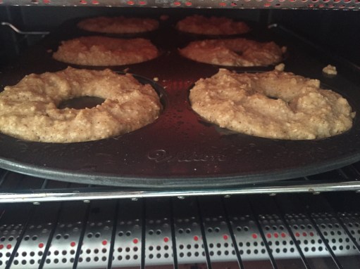 Fill the dough half way in your donut pan. I used a spoon and lightly spread it around evenly. If your batter comes out really doughy, you can circle it around in pieces.