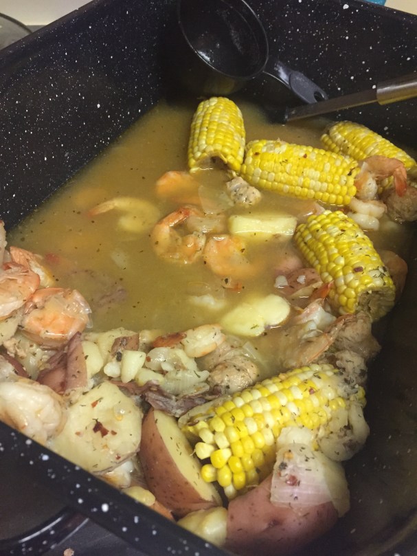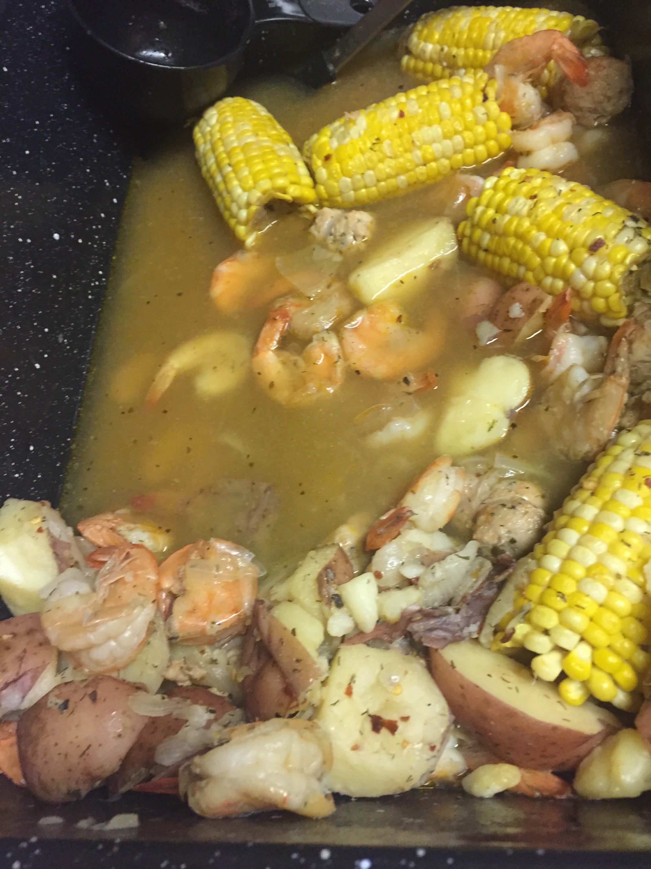 We went back and forth but agreed on having small red potatoes, yellow onions, corn, shrimp and turkey sausage! Don’t hesitate with playing around with this recipe. You can come up with a variety of flavors by using different seasonings and vegetables. We seasoned ours with old bay, dill, salt, hot sauce, pepper and red pepper!