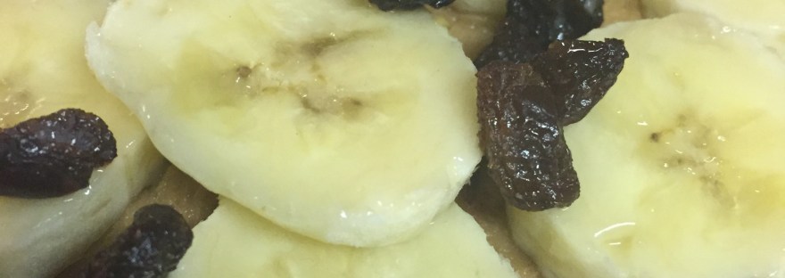 Smart snacking under 150 calories! Half a slice from a 100 calorie sandwich thin. Sliced bananas. JIF peanut butter whip (two tablespoons for 140 calories compared to regular peanut butter at 200 calories) Raisins. Deliish!
